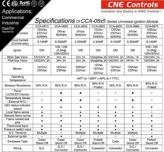 The CCA 80x5 Series Ignition Module is designed for use in many types of gas-fired commercial and industrial appliances. The system acts on a demand for heat by switch or thermostat. A microprocessor is used to monitor, analyze and control gas burner operation. This Design is certified to CAN/CSA C22.2 No. 60730-2-5-2014 and ANSI Z21.20 -2014, which makes the system more reliable and efficient.